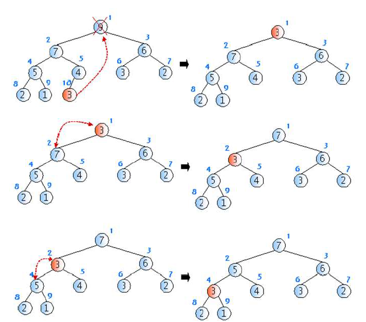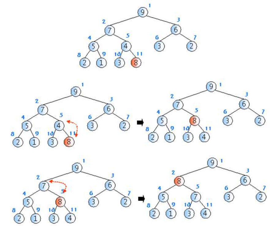 - item 인덱스(i)가 해당 인덱스의 부모 인덱스보다 작아질 때 까지 (1), (2) 반복