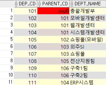 CONNECT BY NOCYCLE PRIOR DEP_CD = PARENT_CD; -- PRIOR 자식 = 부모 (부모->자식 순방향 전개)