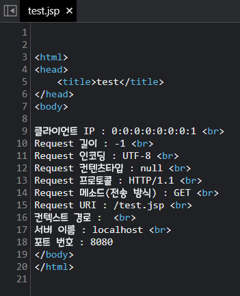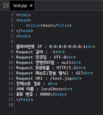 | contentType | JSP가 생성할 문서의 MIME 타입 & 캐릭터 인코딩 지정 | text/html |