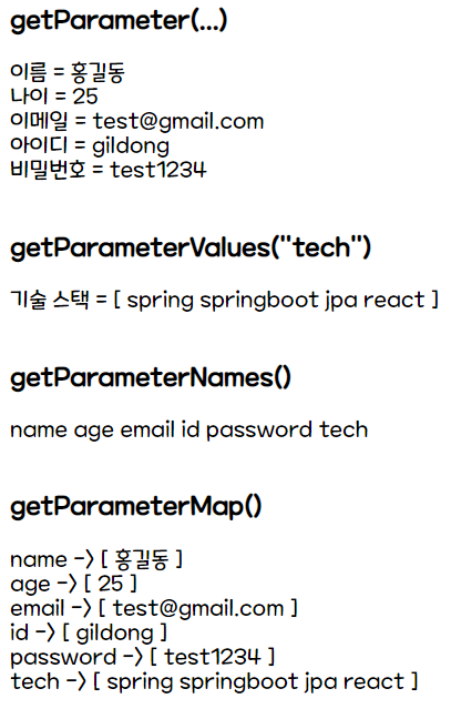 | java.util.Map getParameterMap() | 웹 브라우저가 전송한 파라미터의 Mapping 쌍 구하기 >> [파라미터 이름 : 값]으로 구성 |