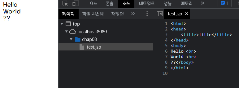 실제로 JSP 페이지는 일단 자바 소스코드로 변환이되고, 해당 자바 소스코드는 서블릿 클래스로 컴파일이 되는데 이 과정에서 "Hello " / "World " / "??" 를 HTML 코드 관점에서 보면 그냥 1줄로 표기되는 방식이다. 따라서 실제 웹 페이지에서 개행을 하려면 println()안에 <br>을 넣어줘서 서블릿 클래스가 <br>을 인식하도록 해줘야 한다