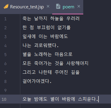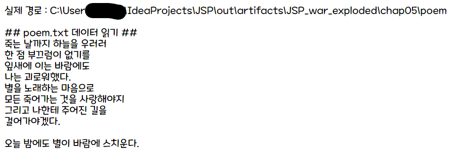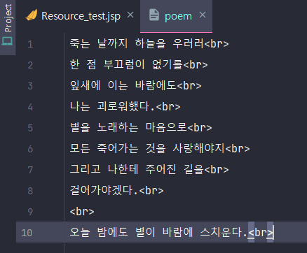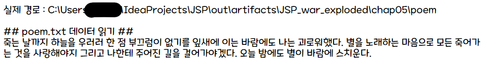 >> 시가 1줄로 나오는 이유는 poem.txt의 데이터를 결국 서블릿 클래스로 컴파일해서 JSP 페이지가 Client에게 전송되는데 서블릿 클래스에서 개행을 의미하는 <br>이 시에 없기 때문에 1줄로 나온다