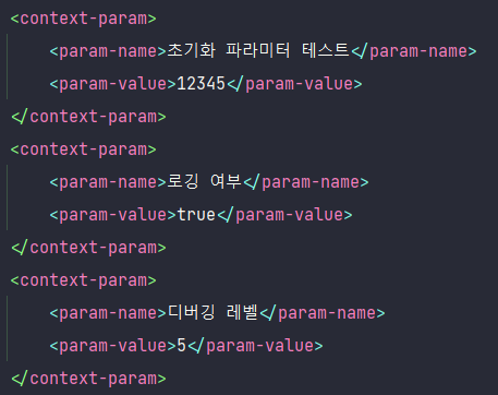 >> 주로 DB 연결과 관련된 설정 경로 / 로깅 설정 파일 / 주요 속성 정보를 담고 있는 파일 경로 등을 지정할 때 초기화 파라미터를 사용한다 :: 그러면 모든 JSP 페이지가 해당 파라미터들을 사용할 수 있다