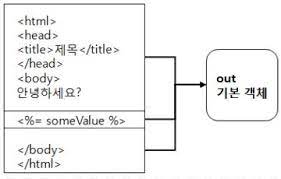 - JSP 페이지 내의 비-스크립트 요소들(HTML & 텍스트)은 out 기본 객체에 그대로 전달된다