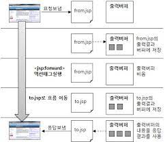 <jsp:forward> 액션 태그를 실행하기 전에는 출력 버퍼에 존재하는 모든 데이터를 지운다. 이러한 이유 때문에 <jsp:forward> 전에 출력 버퍼에 존재하던 여러 내용들이 최종 결과에서는 보이지 않는 것이다