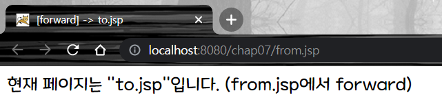 URL을 보면 from.jsp이지만 <jsp:forward> 액션 태그로 인해서 흐름이 to.jsp로 넘어갔고 최종적으로 Client에게 전달된 결과는 to.jsp의 내용이다