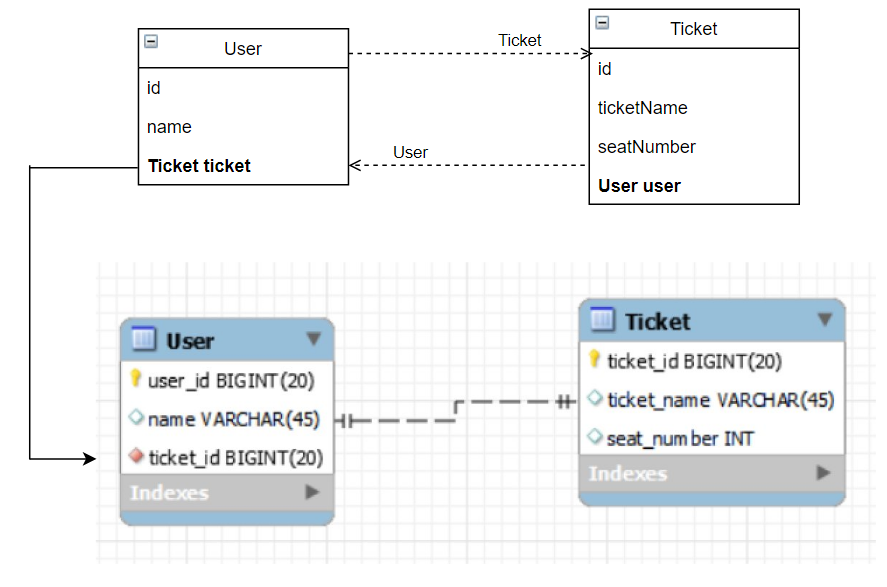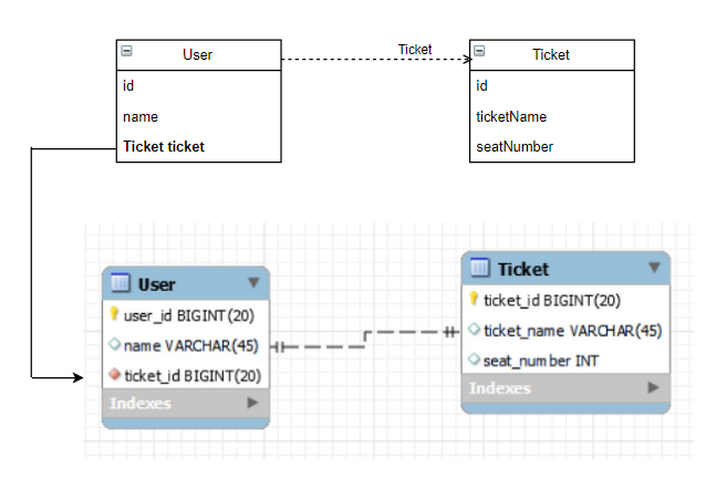 일반적으로 생각해보면 "User는 Ticket 하나를 소유할 수 있다"이므로 User를 "주테이블"로 생각해서 매핑해보자