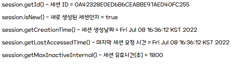 - getSession() 또는 getSession(true)를 통해서 session을 받으면 1) 이미 세션이 존재한다면 해당 세션을 반환 & 2) 세션이 없다면 신규 세션 생성