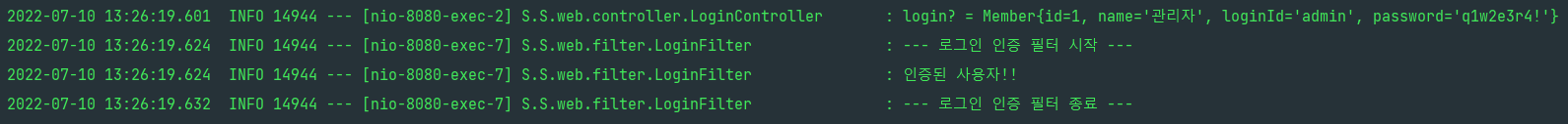 로그인에 성공한 "admin"은 로그인 인증 필터를 통과해서 정상적으로 서블릿이 호출되고 컨트롤러가 호출됨에 따라 "/member/1"에 접근할 수 있다