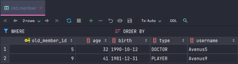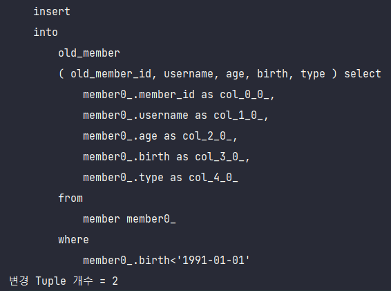 "INSERT INTO OldMember(id, username, age, birth, type) " +