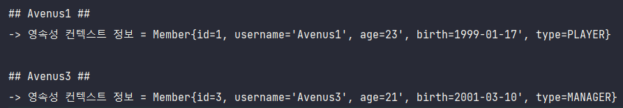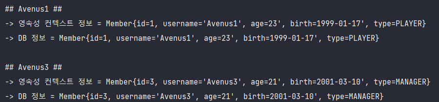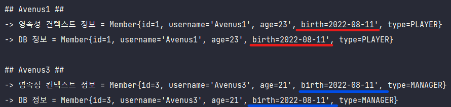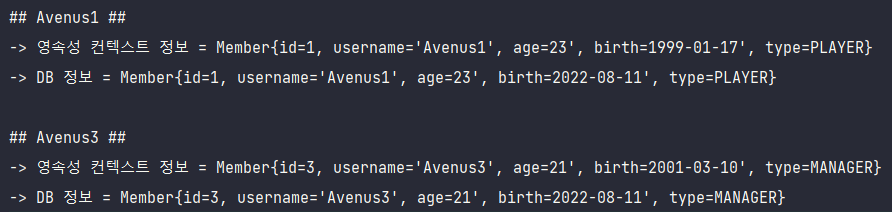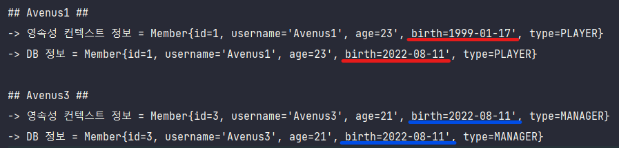 결과를 보면 영속성 컨텍스트 1차 캐시에 존재하는 멤버의 birth정보와 DB에 존재하는 멤버의 birth정보가 서로 다름을 확인할 수 있다