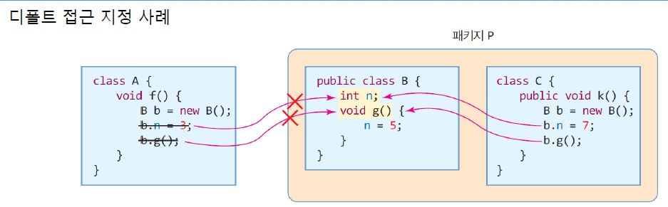 - 동일 패키지 내에 있는 클래스들만 default 멤버에 접근