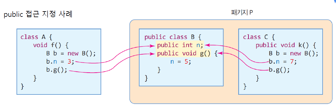 | 접근 가능 영역 | 클래스 내 | 동일 패키지 내 | 동일 패키지 + (다른 패키지에 있는데) 자식 클래스 |