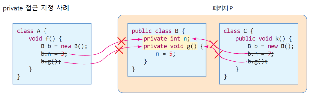 - 비공개 -> 클래스 내의 멤버들에게만 접근 허용