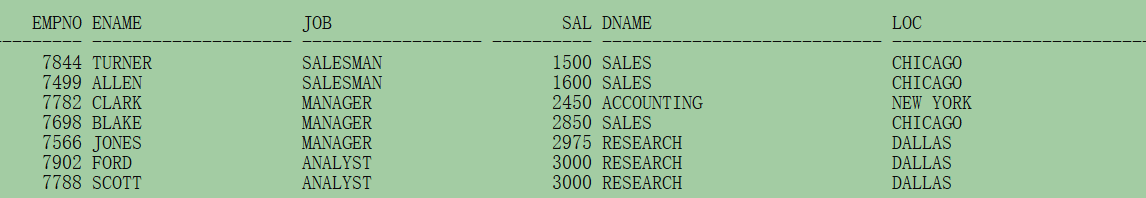 WHERE emp.deptno = dept.deptno AND (sal >= 1500 AND sal <= 3000)