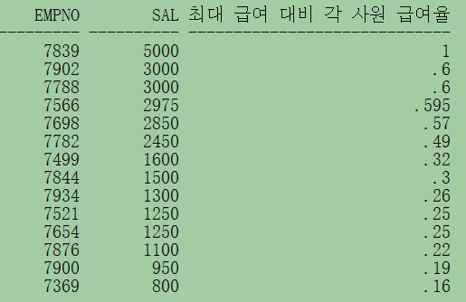 SELECT empno, sal, sal/(SELECT MAX(sal) FROM emp) AS "최대 급여 대비 각 사원 급여율"
