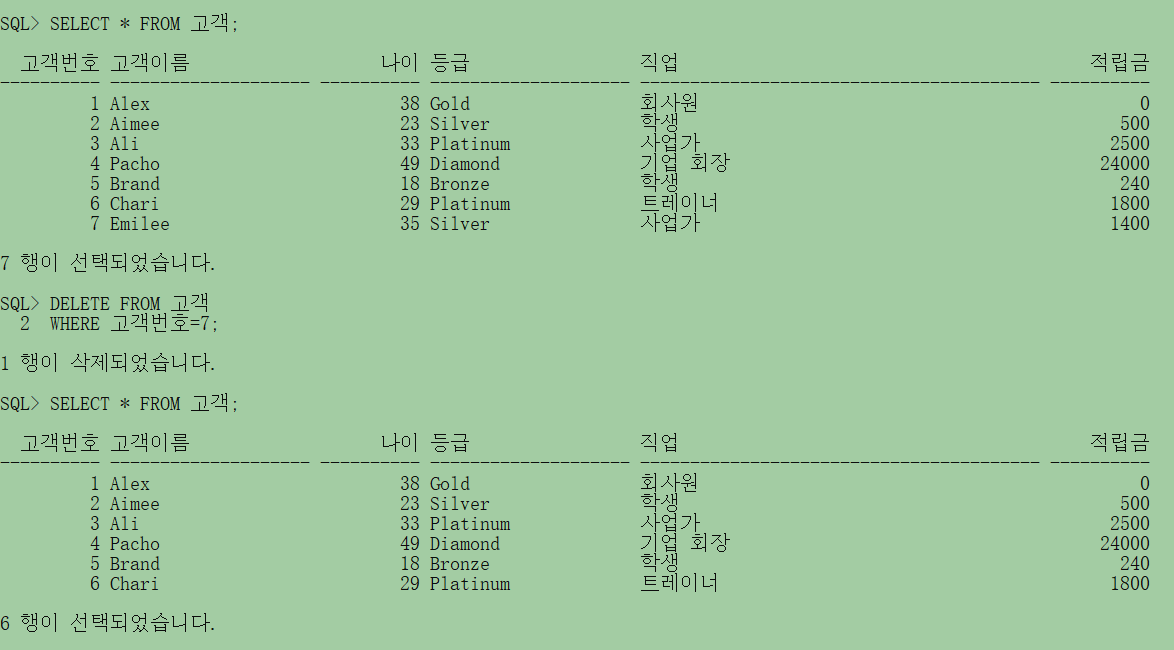 INSERT INTO 고객 VALUES (5,'Brand',18,'Bronze','학생',240);