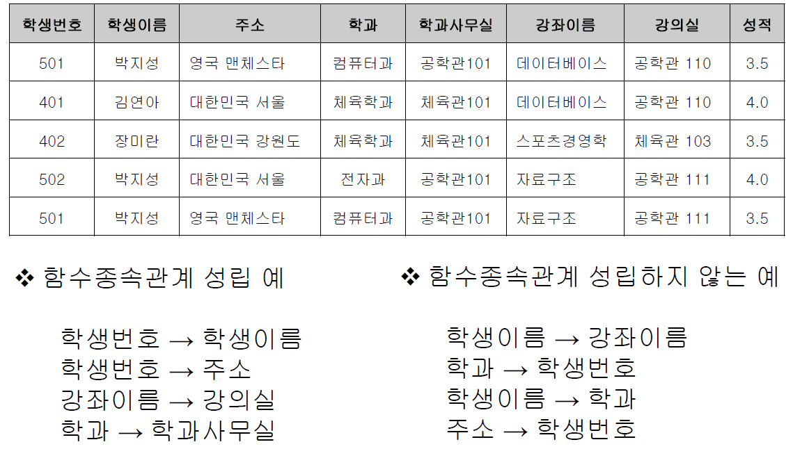 - 그러나, 함수 종속 X -> Y의 경우 : 속성 X가 반드시 키라는 것을 요건으로 하지 않는다