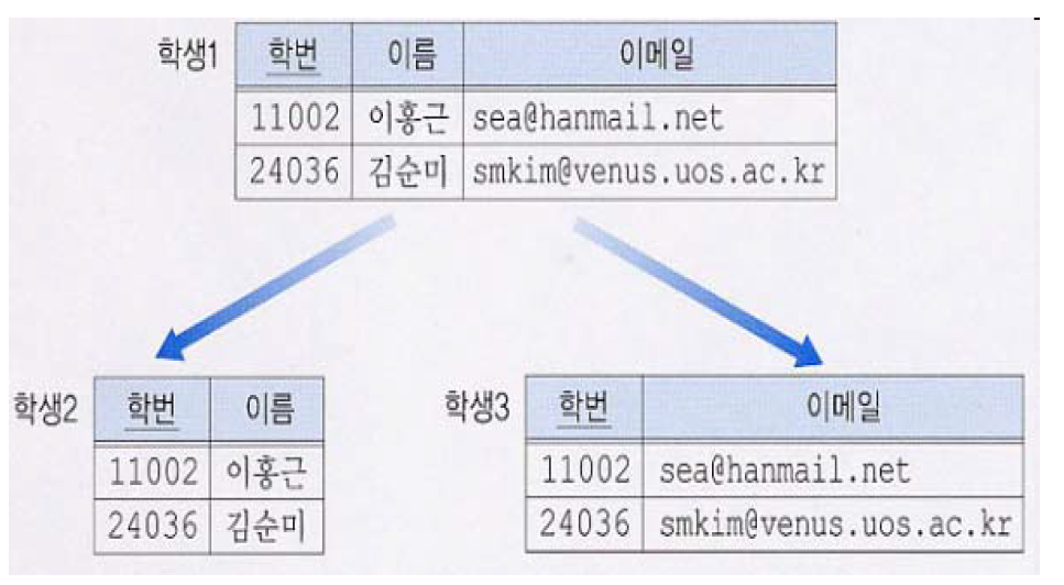 - 1개의 릴레이션을 여러 개의 릴레이션으로 표현