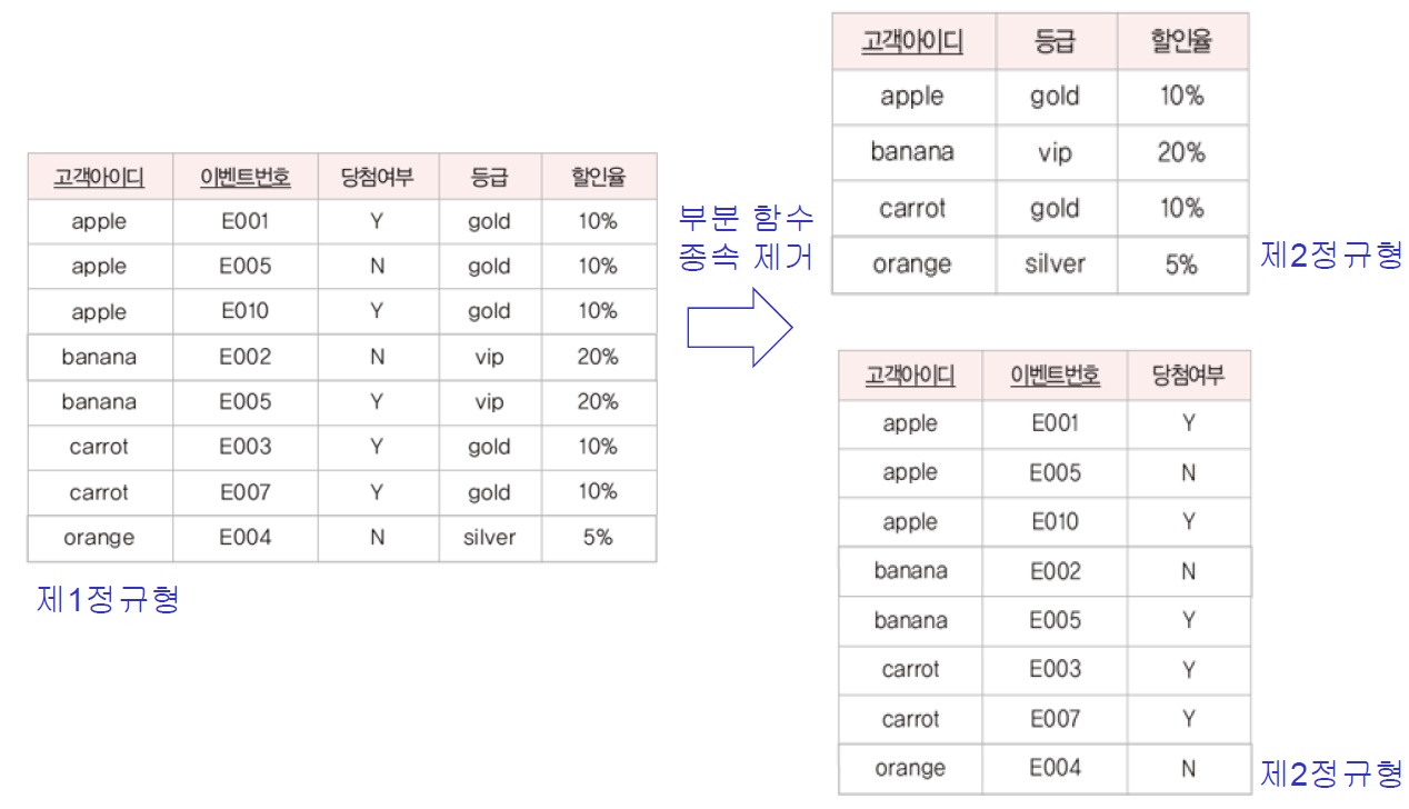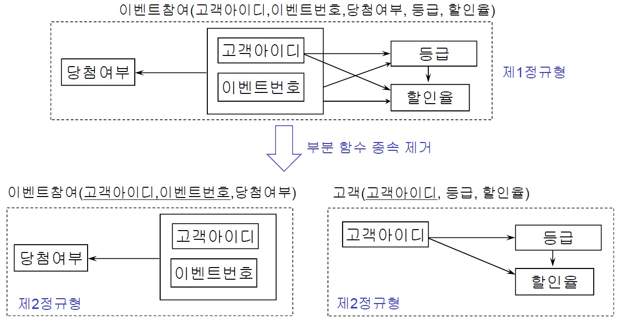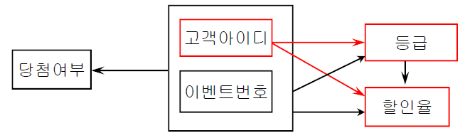 - 함수 종속 : 고객 아이디 -> 등급 / 고객 아이디 -> 할인율 / 등급 -> 할인율 / (고객 아이디, 이벤트 번호) -> 당첨 여부 / (고객 아이디, 이벤트 번호) -> 등급 / (고객 아이디, 이벤트 번호) -> 할인율