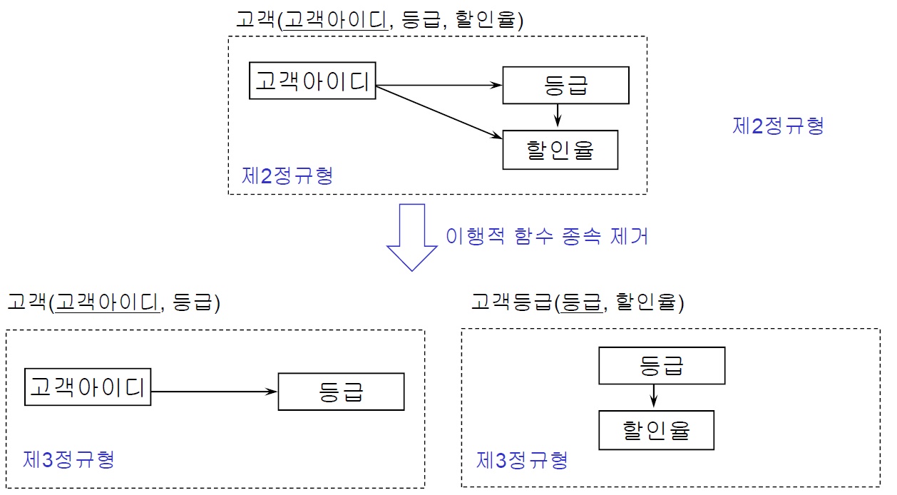 - 제2 정규형(2NF) + 기본키가 아닌 모든 속성들이 기본키에 이행적 함수 종속되지 않음