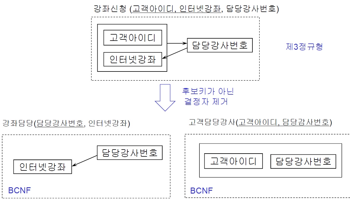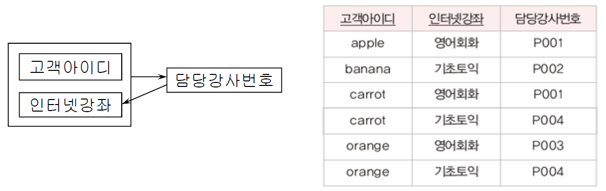 - 함수 종속 : (고객 아이디, 인터넷 강좌) -> 담당 강사 번호 / 담당강사번호 -> 인터넷 강좌