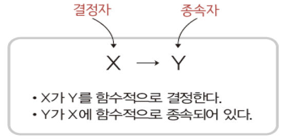 - X와 Y를 임의의 속성들의 집합이라고 할 때, X의 값이 Y의 값을 유일하게 결정(X의 값에 대해 반드시 한 개의 Y값이 대응)한다면, "X는 Y를 함수적으로 결정한다"라고 한다