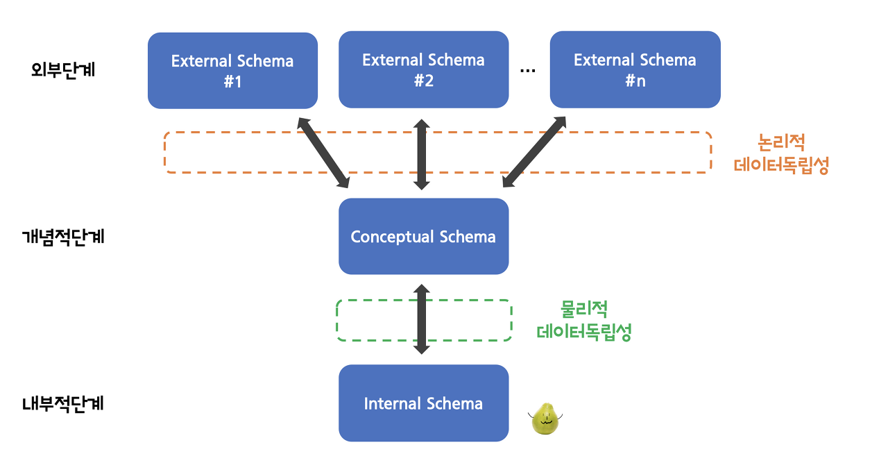 - 하위 스키마를 변경해도 상위 스키마가 영향을 받지 않는 특성