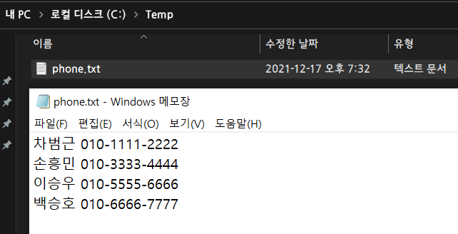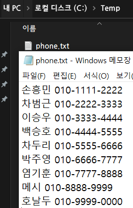 앞서 저장한 c:\temp\phone.txt 파일을 읽어 화면에 출력하라