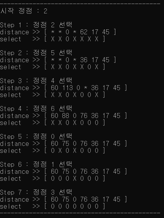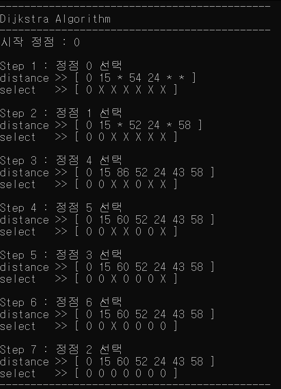 - 정점 0으로부터 각 정점까지의 최단경로 탐색 알고리즘 종료