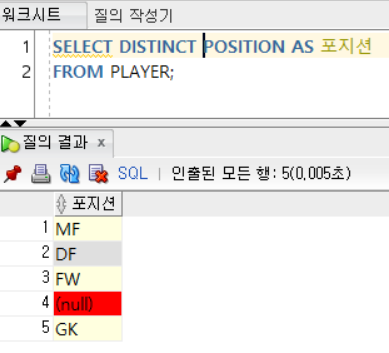 SELECT DISTINCT POSITION [AS] 포지션