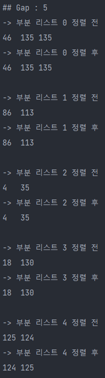 - → gap만큼 아래로 내려가서 해당 요소와 비교 (index = 5-gap)