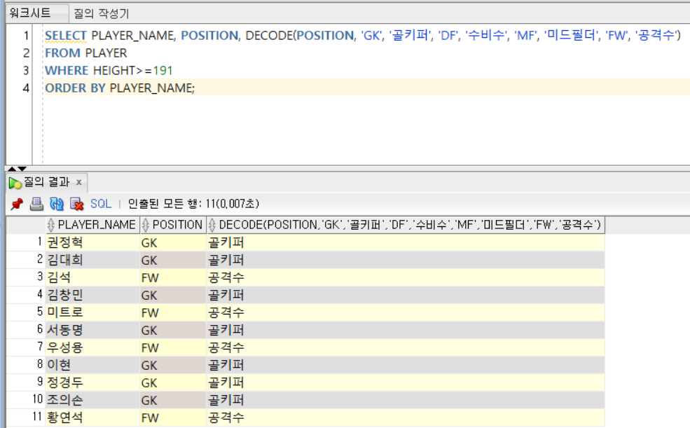 DECODE(컬럼, 조건1, 결과1, 조건2, 결과2, 조건3, 결과3,....);