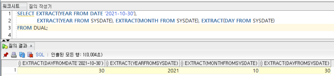 | 날짜형 함수 | DATE 타입의 값 연산 | - SYSDATE / GETDATE - EXTRACT / DATEPART - TO_NUMBER(TO_CHAR(d, 'YYYY'|'MM'|'DD')) / YEAR|MONTH|DAY |