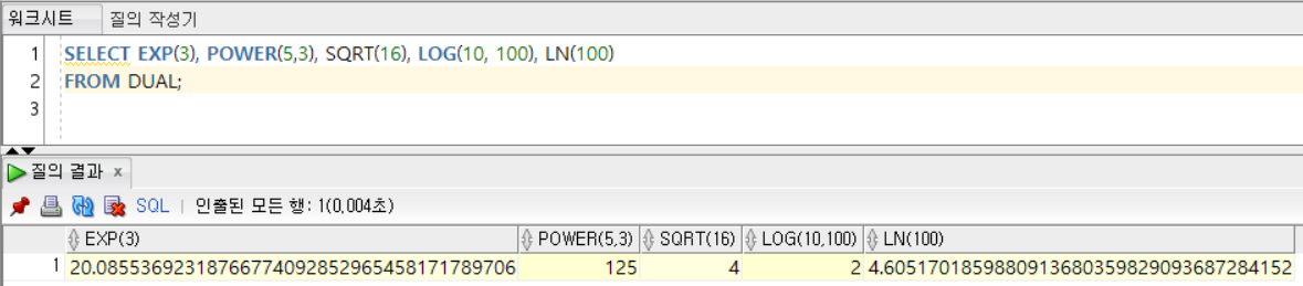 - EXP = e의 n승 / POWER = n1의 n2승 / SQRT = 루트 n / LN = 자연로그(밑이 e)