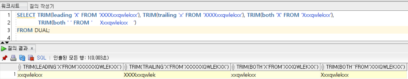 ≫ TRIM( [leading|trailing|both] 지정문자 FROM s)