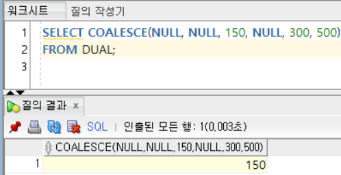 - n1이 NULL이면 n2 리턴 / n1이 NOT NULL이면 n1 리턴