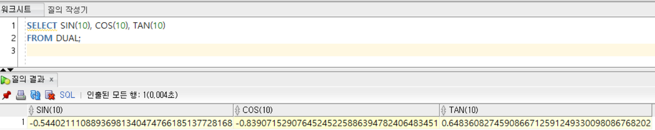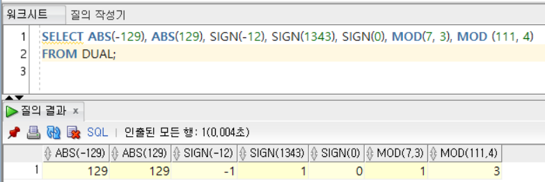 - ABS = 절댓값 / SIGN = 양수(1) or 음수(-1) or 0 / MOD = 나머지 값 리턴