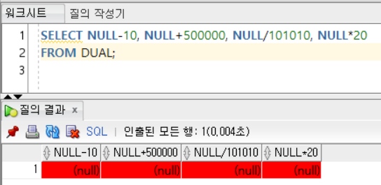 - NULL과 어떤 숫자를 연산하든 간에 결과는 NULL이다