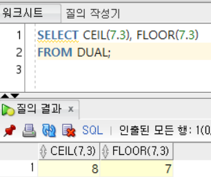 - CEIL = n보다 큰 최소 정수, FLOOR = n보다 작은 최대 정수