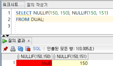 - n1과 n2가 같으면 NULL 리턴 / n1과 n2가 다르면 n1 리턴