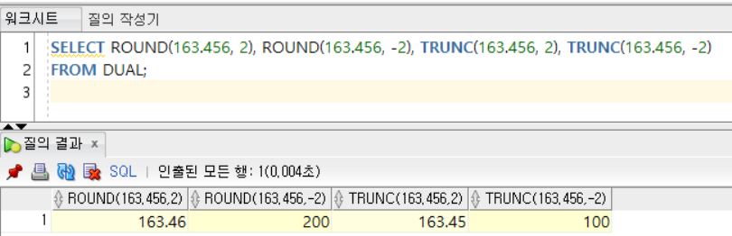 - ROUND = 정수 |m|자리에서 반올림 / TRUNC = 정수 |m|자리까지 버림