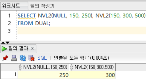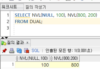 - n1이 NULL이면 n2 리턴 / n1이 NOT NULL이면 n1 리턴
