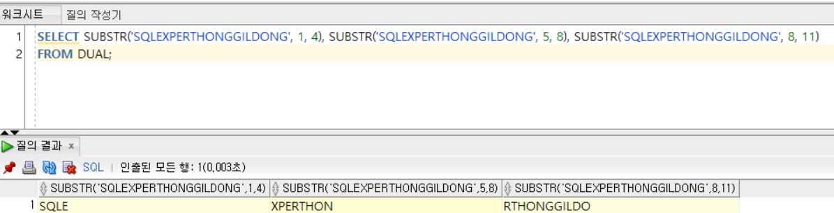 - LOWER(s), UPPER(s) - SUBSTR(s, m, n) / SUBSTRING(s, m, n) - LENGTH(s) / LEN(s) - LTRIM(s, 지정문자), RTRIM(s, 지정문자) - TRIM( [leading|trailing|both] 지정문자 from s) - ASCII(c), CHR(아스키n) / CHAR(아스키n) |
