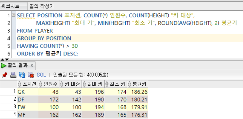 - HAVING 절은 GROUP BY 절 뒤에 온다