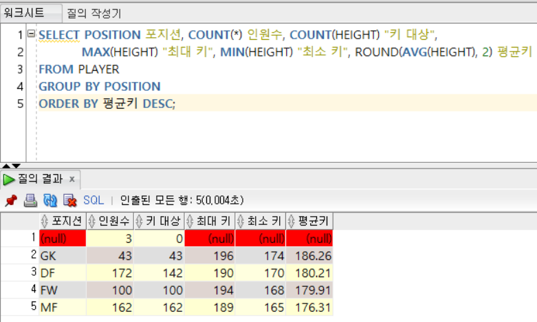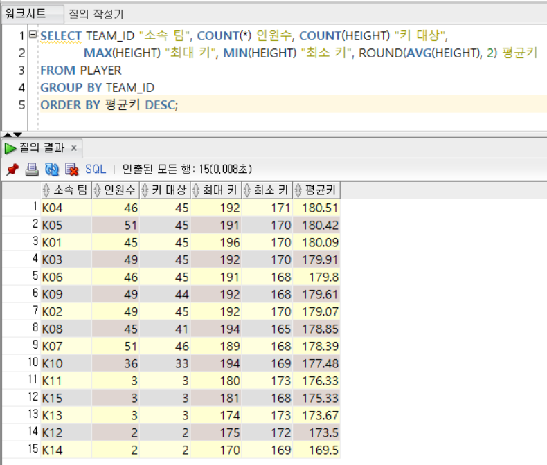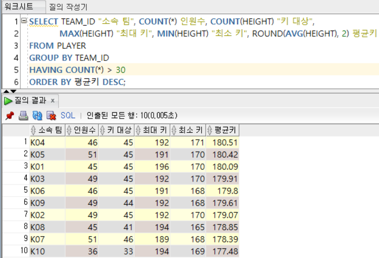- HAVING 절은 GROUP BY 절 뒤에 온다