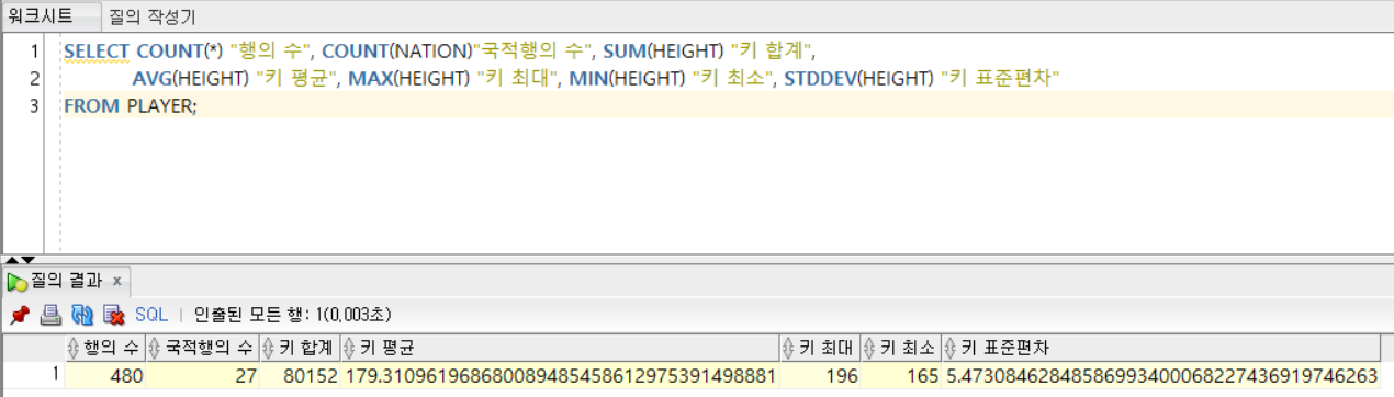 - 집계 함수의 통계정보는 NULL 값을 가진 행을 제외하고 수행