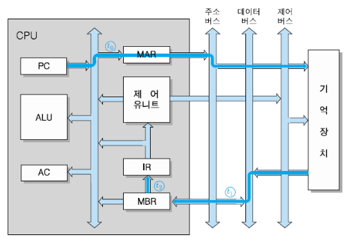 - 현재 PC의 내용(인출할 명령어 주소)을 CPU 내부 버스를 통해서 MAR로 보내기