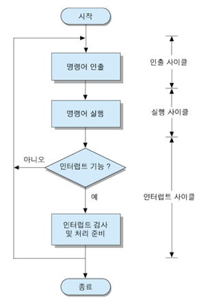 # CPU는 실행 사이클 종료 ~> 인출 사이클 시작 사이에 인터럽트 요구 신호가 들어와서 대기 중인지 검사