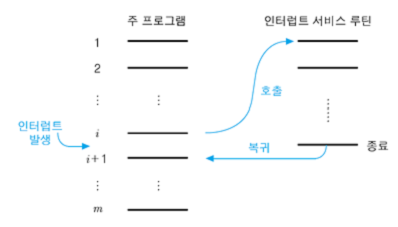 - 인터럽트 요청이 들어오면, CPU는 원래 프로그램 수행을 중단하고, 요구된 인터럽트를 처리하기 위한 프로그램을 수행 (인터럽트 서비스 루틴 : Interrupt Service Routine : ISR)